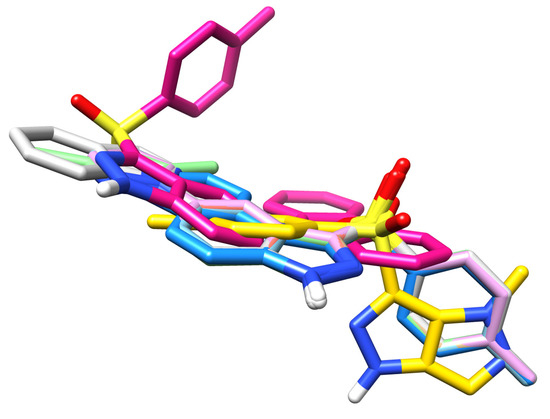 Nine poses were obtained for each of azole 1–9 from which the first poses had the lowest negative value of binding affinity (Table 1). Analysing the optimised azole ligands (Gaussian 16 C.01 program [25]) docked to the protein (PDB code: 3ewh.pdb, AutoDock Vina [26]), we noticed that ligands 1–6 and 9 nearly overlapped (Figure 1). The carbazole ring of compound 7 was oriented almost perpendicular to the plane of the tosyl substituent on compounds 2–6. On the other hand, this tosyl substituent present in compound 7 was perpendicular to the plane formed by the other heteroaromatic rings linked to the indazole moiety (compounds 2–6). For fused pyrazole 8, we observed that the planar pyrazolopyrazole core significantly superimposed with the plane of the tolyl rings of indazoles 1–6, while this tolyl ring on carbazole 7 notably overlapped with the indazole plane for derivatives 1–6.