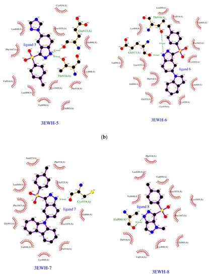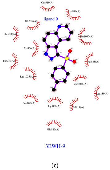 The human VEGFR2 kinase protein in complex with a K11 derivative, acquired from the Protein Data Bank base (PDB entry: 3ewh with the resolution of 1.60 Å), was selected as the biological target [27,28] as one of the most used for docking PDB version of the human VEGFR2 kinase [29,30,31,32,33,34,35,36]. An initial target for further optimization was prepared by removing the internal ligand (K11 derivative) from the 3ewh.pdb file but keeping the internal coordinates unchanged. The genetic algorithm (GA) method implemented in the program AutoDock Vina [26] was employed to locate the appropriate binding orientations and conformations of the compounds into the VEGFR2 binding pocket. For each type of atom within the structure of protein or ligand, Gasteiger charges were computed. Moreover, an ‘autodock type’ was assigned to each atom. All water molecules and internal ligand (K11 as a fused azole derivative) were removed from the original PDB file (the 3ewh.pdb). Polar hydrogen atoms were added, and partial charges were assigned to the protein. Then the internal ligand was replaced by the optimized structure of investigated hetarenes 1–9 and additionally, the residues were saturated with hydrogen atoms. To carry out docking simulation, a grid box was defined to be of 10 Å size (centre_x = 17.783, centre_y = −7.351, centre_z = 5.179). The outputs (*.pdbqt files) after docking procedure were visualized using the Chimera 1.13.1 package [54]. The projections of the 1st poses of azoles 1–9 docked to the kinase pocket were visualised with LigPlot+ v.2.2 software [55,56] (Figure 2a–c).