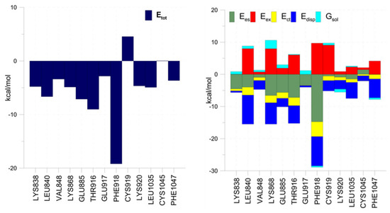 The same analysis by the SAPT approach showed that the interaction energy involving Phe918 was the lowest for indole 6 (energetic components, i.e., electrostatics, exchange, induction, and dispersion terms were as follows: −3.830, 11.340, −1.580, −9.600 kcal/mol, respectively) and the highest for fused pyrazole 8 (energetic components, i.e., electrostatics, exchange, induction, and dispersion terms were as follows: −0.490, 2.810, −0.290, −2.860 kcal/mol, respectively), while the energy for Phe1047 was the lowest for carbazole 7 (electrostatics, exchange, induction and dispersion terms were as follows: −8.120, 19.980, −2.350, −19.460 kcal/mol, respectively) and the highest for fused azole 9 (electrostatics, exchange, induction and dispersion terms were as follows: −1.630, 12.680, −1.940, −8.040 kcal/mol, respectively).