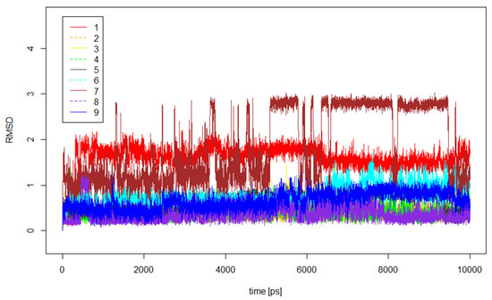 Next, the 100-ns-long molecular dynamics (MD) simulations were performed to explore the stability of binding modes of ligands 1–9 in the VEGFR2 pocket. For this purpose, the Desmond software from Schrődinger Suite [49] was employed to simulate the solvated complexes. The time-evolution of RMSD values of the ligand in the ligand-protein complexes is shown in Figure 4.