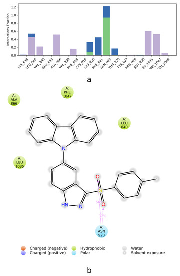 The MD simulation concerning Phe918 and azoles 1–9 supports the docking data. The interactions involving Phe918 were of hydrophobic nature, although their percentages were different for the stabilisation of azole–kinase complexes. Such contact was not detected for compound 1 and had marginal values for azoles 2–5. However, it was clearly visible for indole 6 as well as carbazole 7 and condensed pyrazole 8. The hydrophobic interactions involving Cys919 and ligand 7, observed in the docking procedure, were also detected by the MD simulation. Nevertheless, these interactions’ share was marginal for most of the azoles and imperceptible for ligand 8. Besides, they were usually facilitated by the presence of water bridges.