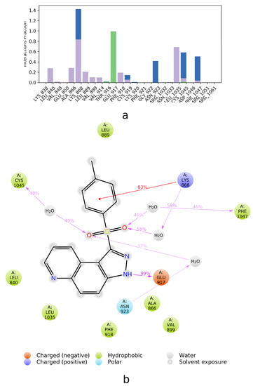 Considering the above criteria, we observed that Glu885 interacted in the MD trajectory through water bridges only with chlorine derivative 1 and fused pyrazole 8. The share of the sulphonyl group (compound 1) or pyridinic nitrogen atom (compound 8) in the interactions with water molecules was 37% or 10%, respectively. The same percentage, i.e., 37 or 10%, was observed for interactions of water bridges with Glu885.