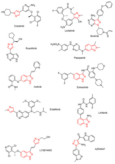 Pyrazole and indazole derivatives constitute an important group of kinase inhibitors [10,11,12,13]. Several anticancer agents containing the above heterocyclic rings have been approved for use in the treatment of solid tumours and leukemia (Scheme 1). Crizotinib is a first generation ALK and c-Met kinase dual inhibitor, approved in 2011 for the treatment of non-small cells lung cancer (NSCLC). Unfortunately, NSCLC patients rapidly developed resistance to crizotinib [14], which spurred search for new, more effective anticancer agents. Lorlatinib belongs to the third generation of ALK inhibitors. This 12-membered macrocycle containing a pyrazole scaffold was approved in 2018 for the treatment of anaplastic large cell lymphoma (ALCL) and neuroblastoma [14]. Ruxolitinib is a Janus kinase (JAK) inhibitor, the first drug that was approved for the treatment of intermediate- and high-risk myelofibrosis in 2011 [11]. Ibrutinib, a pyrazolopyrimidine derivative, is a Bruton’s tyrosine kinase (BTK) inhibitor useful for the treatment of mantle cell lymphoma and chronic lymphocytic leukemia. This anticancer agent got FDA approval in 2013 [11].