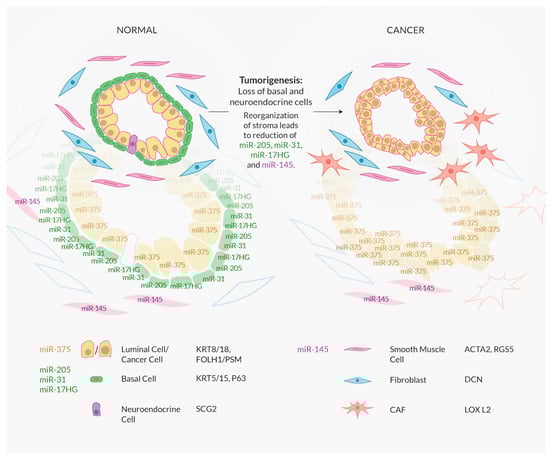 Overview of the changes in tissue organization that underlie some changes in miRNA and protein expression. Reduction in the expression of miR-205, miR-31, miR-145, and the miR-17-92 cluster are frequently observed in prostate cancer studies. These changes can be explained by the loss of basal cells (miR-205, miR-31, and miR-17HG), reorganization of the stroma (reduction in miR-145) and overexpression of miR-375 in cancerous luminal cells. Similar changes can be observed in the expression of mRNAs coding for basal cell markers such as KRT5, KRT14, or p63, while luminal markers KRT8/18 and Folate Hydrolase 1 (FOHL1/PSM) are frequently overexpressed in prostate cancer. It is still unclear, due to a lack of comprehensive miRNA in situ hybridization (ISH) data, which miRNA changes in prostate cancer are mainly due to changes in tissue cell composition. A recent study on normal mouse prostate suggest that few miRNAs show substantial differences in expression with the exception of miR-205, miR-17, miR126a (basal) and miR-375 and miR-148a (luminal) [].