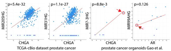 Relationship between neuroendocrine-like differentiation (CHGA+, miR-7+) in response to androgen suppression therapy. TCGA data and data from Gao et al. [] were analyzed using the cBioPortal (https://www.cbioportal.org) using the co-expression tool []. Expression values are in log2. P-values are for the Spearman test. The red circles and arrows depict a prostate cancer organoid with neuroendocrine characteristics (CHGA+, miR-7+, AR−, miR99alow, plus a lack of cytokeratin expression []) derived from a “prostate cancer with treatment-induced neuroendocrine differentiation”. Collectively, these data suggest that true and complete neuroendocrine differentiation is rare in prostate cancer.