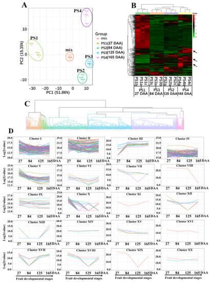 Dynamic metabolome of apple development and ripening: (A) Principal component analysis of metabolomics data from four developmental stages of the “Pinova” fruit. “Mix” means the balanced mixture of all fruit samples (quality control). (B) A heat map of the identified metabolites in apple at four developmental stages: The colors indicate the relative content of each identified metabolite among the different developmental stages as determined by the average peak response area by UPLC-MS. (C) Clustering analysis of all 462 metabolites according to their variation tendency during four fruit-development stages and (D) metabolite variation tendencies among the twenty cluster profiles. PS1, 2, 3 and 4 mean the four apple-development stages: PS1 represents 27 Days After Anthesis (DAA); PS2 represents 84 DAA; PS3 represents 125 DAA; and PS4 represents 165 DAA.