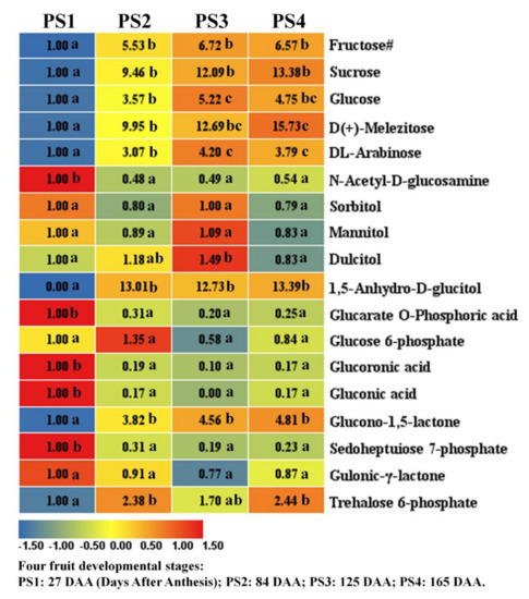 Sugar metabolites detected by widely-targeted UPLC-MC during four fruit developmental stages. Four ‘Pinova’ fruit development stages were analyzed: 27 (PS1), 84 (PS2), 125 (PS3) and 165 (PS4) Days After Anthesis (DAA), respectively. The fold changes of each metabolite among these four stages were displayed in heat map which used the first stage of 27 DAA as the calibrator. The Fructose# means that we additionally applied GC-MS to detect fructose content, because we failed to identify fructose by widely-targeted LC-MS metabolomics approach in this study. Three independent replicates were performed for each stage. Significant analysis was performed by SPSS software based on Tukey’s test at p < 0.05 level and showed with lower cases a, b, and c in figure. Different letters indicate significant differences between two samples.