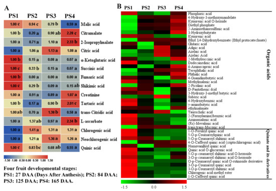 Changes of organic acids and quinate (and its derivatives) during four fruit developmental stages. (A) Heat map of 15 representative organic acids: the fold changes of each metabolite among these four stages were displayed in heat map which used the first stage of 27 Days After Anthesis (DAA) as the calibrator. PS1, 2, 3, and 4 represents four fruit developmental stages: 27, 84, 125, 165 Days After Anthesis (DAA), respectively. Significant analysis was performed by SPSS software based on Tukey’s test at p < 0.05 level and showed with lower cases a, b, and c in figure. Different letters indicate significant differences between two samples. (B) Heat map of organic acids and quinate (and its derivatives): the colors indicate the proportional content of each identified metabolites as determined by the average peak response area with R scale normalization. Three independent replicates were performed for each stage.