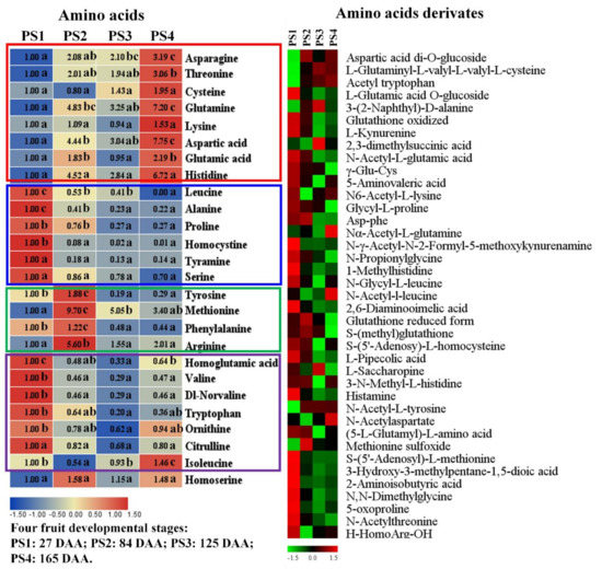 Amino acids (left) and their derivates (right) detected by widely-targeted UPLC-MC during four fruit developmental stages. For the amino acids, the fold changes of each metabolite among four stages were displayed in heat map which used the first stage of 27 Days After Anthesis (DAA) as the calibrator. PS1, 2, 3, and 4 represents four fruit developmental stages: 27, 84, 125, 165 Days After Anthesis (DAA), respectively. Significant analysis was performed by SPSS software based on Tukey’s test at p < 0.05 level and showed with lower cases a, b, and c in figure. Different letters indicate significant differences between two samples. For the amino acids derivates, the colors indicate the proportional content of each identified amino acids derivates as determined by the average peak response area with R scale normalization. PS1, 2, 3, and 4 represents four fruit developmental stages: 27, 84, 125, 165 Days After Anthesis (DAA), respectively. Three independent replicates were performed for each stage.
