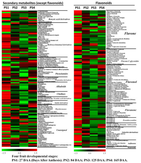 Distributions of accumulation profiles of flavonoids and other secondary metabolites detected by widely targeted UPLC-MC during four fruit-development stages: The colors indicate the proportional content of each identified metabolite as determined by the average peak response area with R scale normalization. PS1, 2, 3 and 4 represent four fruit-development stages: 27, 84, 125 and 165 Days After Anthesis (DAA), respectively. Three independent replicates were performed for each stage.