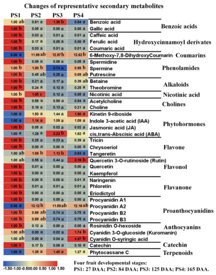 Representative secondary metabolites detected by widely-targeted UPLC-MC during four fruit developmental stages. The fold changes of each metabolite among these four stages were displayed in heat map which used the first stage of 27 Days After Anthesis (DAA) as the calibrator. PS1, 2, 3, and 4 represents four fruit developmental stages: 27, 84, 125, 165 Days After Anthesis (DAA), respectively. Three independent replicates were performed for each stage. Significant analysis was performed by SPSS software based on Tukey’s test at p < 0.05 level and showed with lower cases a, b, and c in figure. Different letters indicate significant differences between two samples.