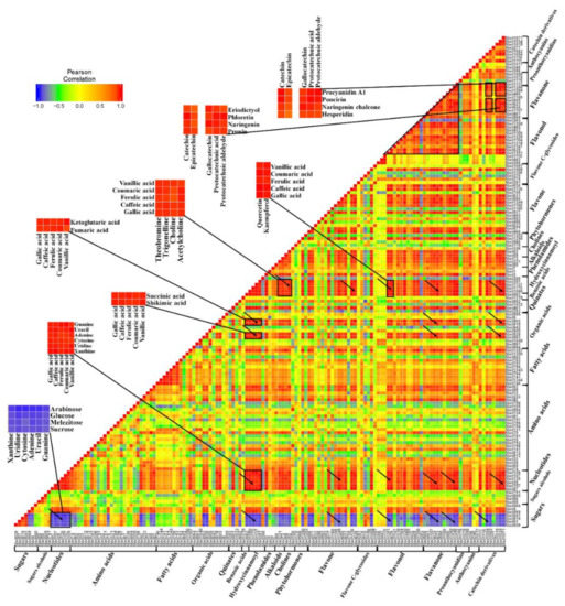 In order to investigate the associations of metabolites across the fruit-development process, correlation analysis was performed on the 149 representative metabolites according to their variation trend. The correlation of each metabolite pair was assessed by calculating the Pearson correlation coefficient. The details of 149 representative metabolites for correlation analysis are listed in Table S2. Furthermore, the correlations of 149 representative metabolites are visualized by a heat map in Figure 7. As shown in Figure 7, the sugars (particularly Suc, melezitose, Glu and arabinose) displayed a reasonable number of distinct negative correlations with metabolite categories across both primary and secondary metabolisms, such as nucleotides (enlarged sections), several organic acids, hydroxycinnamoyl derivates, abundant flavonoids and so on. However, relatively few correlations were apparent for sugar alcohols. For nucleotides, we found high correlations within the nucleotide category. Also, the nucleotides presented extensive positive correlations with many other secondary metabolite categories, including benzoic acids, hydroxycinnamoyl derivates (enlarged sections), alkaloids, cholines, flavonol, flavanone and catechin derivatives (arrows in Figure 7). Four organic acids, including succinic acid, shikimic acid, α-ketoglutaric acid and fumaric acid, displayed significant correlations with benzoic acids, hydroxycinnamoyl derivates which contained gallic acid, caffeic acid, ferulic acid, coumaric acid and vanillic acid (enlarged sections). Moreover, these four organic acids showed a high correlation level with several flavonoids (arrows in Figure 7). Additionally, benzoic acids and hydroxycinnamoyl derivates displayed high correlations with alkaloids; cholines (enlarged sections); and abundant flavonoids including flavones, flavonols, flavanone, proanthocyanidins and catechin derivatives (arrows in Figure 7). For the flavonoids, most of metabolites assigned to flavonols and flavanone presented high correlations within its own category and between these two categories (triangle in Figure 7). Moreover, more than half of catechin derivatives showed high correlations with hydroxycinnamoyl derivates and most metabolites assigned to flavonols and flavanone. For example, catechin, epicatechin, gallocatechin, protocatechuic acid and protocatechuic aldehyde presented high positive correlations with prunin, naringenin, phloretin, eriodictyol, hesperidin, procyanidin A1 and so on (Figure 7). The correlation analysis provided insight into links between primary and secondary metabolisms and significant metabolite–metabolite correlations across the different metabolic pathways during apple development and ripening.