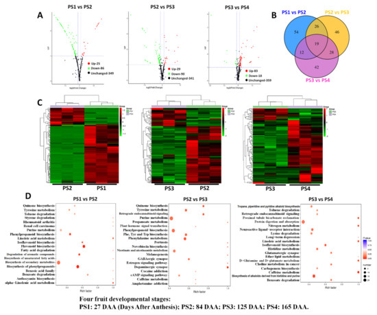 Differentially accumulated metabolites among different fruit-development stages: (A) Volcano plots of differential metabolites among PS1 vs. PS2, PS2 vs. PS3 and PS3 vs. PS4; (B) Venn diagram of differential metabolites among PS1 vs. PS2, PS2 vs. PS3 and PS3 vs. PS4; and (C) heat maps of differential metabolites among PS1 vs. PS2, PS2 vs. PS3 and PS3 vs. PS4. Three independent replicates of each stages were also displayed in the heat map. (D) KEGG pathway assignment of differential metabolites among PS1 vs. PS2, PS2 vs. PS3 and PS3 vs. PS4: The dot color represents the p-value, and the dot size represents the number of differential metabolites. PS1, 2, 3 and 4 represent four fruit-development stages: 27, 84, 125 and 165 Days After Anthesis (DAA), respectively.