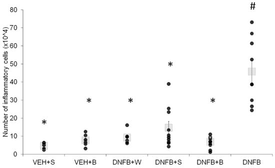 Total number of inflammatory cells per lung. # p < 0.05 vs. VEH+S (Mann–Whitney U test); * p < 0.05 vs. DNFB (Mann–Whitney U test); means ± SE, n = 6–10; VEH+S, sham-sensitized saline-inhaled; VEH+B, sham-sensitized brine-inhaled; DNFB+W, sensitized pure water inhaled; DNFB+S, sensitized saline inhaled; DNFB+B, sensitized brine inhaled; DNFB, sensitized non-inhaled.