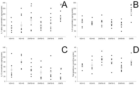 IL-1α (A), IL-6 (B), IL-10 (C) and total glutathione (D) levels in lung tissue. # p < 0.05 vs. VEH+S (Mann–Whitney U test); * p < 0.05 vs. DNFB (Mann–Whitney U test); means ± SE, n = 5–7 VEH+S, sham-sensitized saline-inhaled; VEH+B, sham-sensitized brine-inhaled; DNFB+W, sensitized pure water inhaled; DNFB+S, sensitized saline inhaled; DNFB+B, sensitized brine inhaled; DNFB, sensitized non-inhaled.