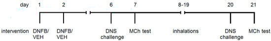 From the 8th day on, both the DNFB-sensitized (sensitized) and vehicle-sensitized (sham-sensitized) animals underwent a 12-day inhalation cycle with an aerosol of pure water (only sensitized animals) (DNFB+W), saline-0.9% NaCl (sensitized and sham-sensitized animals) (DNFB+S and VEH+S, respectively), or 2% brine from the ‘Wieliczka’ Salt Mine (sensitized and sham-sensitized animals) (DNFB+B and VEH+B, respectively). Each inhalation lasted 15 min and was preceded with a 5-min habituation time. The volume of the nebulized solution was 0.45 mL. One group of DNFB-sensitized animals remained non-inhaled (DNFB). One day after the last inhalation, all animals from all groups were challenged once again with DNS. Then, 24 h later, the methacholine test was repeated as described above. An outline of the entire experiment is presented in Figure 6.