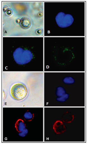 (A) Phase contrast micrograph demonstrating bead-isolated CTCs (40× magnitude). (B) Fluorescent micrograph of a DAPI (4′,6-diamidino-2-phenylindole) stained CTC nucleus. (C) Indirect immunofluorescence (IF) micrograph demonstrating overlapping DAPI-stained CTC nucleus (blue) and CK (cytokeratin, green) fluorescein isothiocyanate (FITC) IF, and (D) CTC CK IF (green), alone. (E) Phase contrast micrograph demonstrating bead-isolated peripheral blood leukocytes (PBL) (40× magnitude). (F) Fluorescent micrograph of a DAPI (4′,6-diamidino-2-phenylindole) stained PBL nucleus. (G) Indirect IF micrograph demonstrating overlapping DAPI-stained PBL nucleus (blue) and protein tyrosine phosphatase receptor C (CD45) (red) FITC IF, and (H) PBL CD45 IF (red), alone.