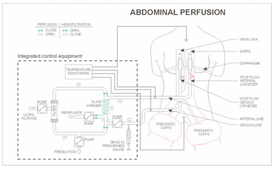HAP procedures were performed under general anaesthesia, as previously described [14,52,53]. Briefly, after systemic heparinisation (150 IU heparin/kg), the common femoral artery and saphenous vein (or femoral vein, or external iliac artery and vein, when necessary) were isolated and cross-clamped. Two, previously heparinised, triple-lumen 12-F gauge balloon catheters (PfM, Cologne, Germany and Dispomedica, Hamburg, Germany), were X-ray guided into both the artery and vein and aortic and inferior cava balloons positioned, by fluoroscopy, just above the celiac trunk, above the confluence of the right hepatic vein and below the right atrium, respectively. After blocking and checking their position with contrast medium, balloons were unblocked and thighs initially blocked with pneumatic cuffs. Under temporary hyperoxygenation, chemotherapeutic agents not influenced by hypoxia and pH < 7.1 [54], such as cisplatin, carboplatin, vinorelbine, etoposide, paclitaxel and docetaxel, were introduced through the aortal catheter, as a bolus, and balloon catheters immediately blocked again. It is mandatory to inject the drugs under prior hyperoxygenation directly before balloon-blocking in order to avoid ischaemic bowel complications and for drug action [53,54]. After balloon catheter inflation, isolated perfusion of the abdominal cavity was performed by way of extracorporeal peristaltic pumps for approximately 15–20 min, under hypoxic conditions to enhance doxorubicin (and other drugs such as mitomycin) cytotoxicity [54], and at a pH of < 7.1 to enhance topotecan cytotoxicity [55]. The extracorporeal circuit (Figure 2) also contained a heating element and a hemofiltration module. Temperature loss was approximated to be 1 °C per meter of tubing and the length of the tubing was 5 m. Therefore, to ensure normothermia the element outlet port was pre-heated to a temperature of approximately 42 °C, ensuring both patient well-being and drug action. At termination of perfusion, the venous balloon was deflated prior to the arterial balloon and lower extremity tourniquets sequentially released upon attainment of a stable hemodynamic profile and the extracorporeal circuit was then subjected to chemo-filtration to reduce systemic drug access in order to reduce side effects. After chemo-filtration, catheters were withdrawn and vessels repaired by 5/0 Prolene suture. Protamine (200 IU/kg) was then injected to reverse the effects of heparin.
