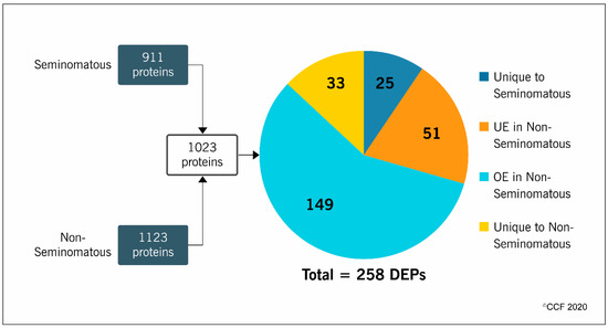 LC-MS/MS analysis identified 911 proteins in the seminomatous group and 1123 in the non-seminomatous group. After comparative analysis between the experimental groups, a total of 1023 proteins were quantified and 258 were differentially expressed (Figure 1). More than half (58%) of the DEPs were overexpressed (149 proteins), while 20% were underexpressed (51 proteins) in the non-seminomatous group. Furthermore, 10% were unique to seminomatous group (25 proteins) and 12% unique to non-seminomatous group (33 proteins) (Figure 1).