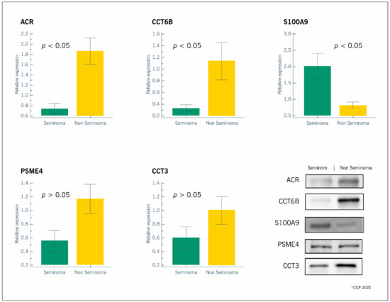All the selected proteins were identified by WB. We confirmed the proteomic results for the overexpressed (ACR, CCT6B, CCT3, PSME4) and the underexpressed (S100A9) proteins in the non-seminomatous group relative to the seminomatous group (Figure 2).