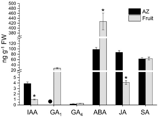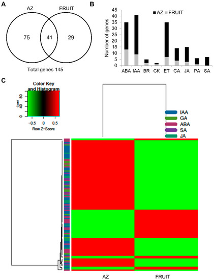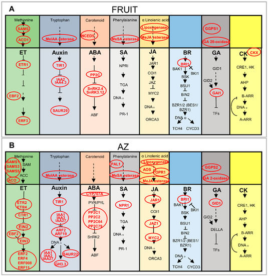 - Kumar, R.; Khurana, A.; Sharma, A.K. Role of plant hormones and their interplay in development and ripening of fleshy fruits. J. Exp. Bot. 2014, 65, 4561–4575. [Google Scholar] [CrossRef]