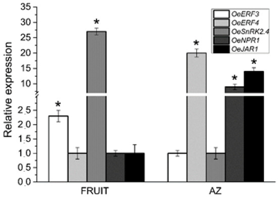 - Parra, R.; Paredes, M.A.; Sanchez-Calle, I.M.; Gomez-Jimenez, M.C. Comparative transcriptional profiling analysis of olive ripe fruit pericarp and abscission zone tissues shows expression differences and distinct patterns of transcriptional regulation. BMC Genomics 2013, 9, 866. [Google Scholar] [CrossRef]
