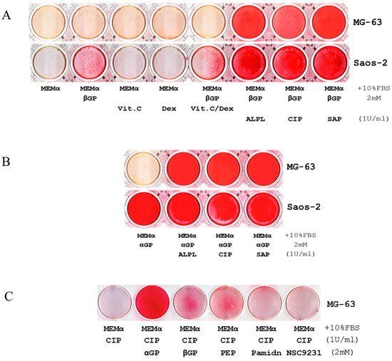 All human and mouse cell lines and human peripheral blood mononuclear cells (MNCs) were maintained in MEMα/10% FBS with penicillin/streptomycin and glutamine in a 37 °C humidified incubator with 5% CO2. In biomineralization assays, the concentrations of αGP (or βGP, NSC 9132, pamidronate, or PEP) as the primary source of organic phosphorus was standardized at 2 mM; and ALPL, CIP, or SAP as a primary source of ALP was standardized at 1 unit/mL (U/mL), respectively. Ascorbic acid (vitamin C) was added at 50 µg/mL (0.284 mM). Dexamethasone (Dex) was added at 100 nM. For adherent cell lines, the assays were performed after 70% confluence was reached in 24-, 12-, or 6-well plates (ThermoFisher Scientific). For nonadherent cell lines, assays were performed in triplicate at an initial density of 1 × 104 cell/well in 96-well plates (ThermoFisher Scientific). The medium was replaced after 4 days. Alizarin Red S staining was performed at room temperature by removing the culture medium, washing the cells twice with 1× PBS (pH 7.4), fixing the cells in 10% neutral buffered formalin (Richard-Allan Scientific, Kalamazoo, MI, USA) for 30 min, rinsing twice with Milli-Q water, staining with Alizarin Red S for 30 min, and destaining twice in Milli-Q water. A ZEISS inverted fluorescence/brightfield microscope equipped with an Infinity 3 digital camera and software system was used for imaging.