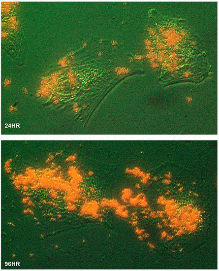 Biomineralization of human cells. The Saos-2 cells grew at low confluency on a glass slide immersed in MEMα/10% FBS with αGP (2 mM) for 24 h (24HR) and 96 h (96HR), respectively. The slides were washed, fixed, and stained with Alizarin Red S. The cell morphology was illustrated using optical phase-contrast (with pseudo-green background), and HAP minerals were in red under a ZEISS inverted microscope equipped with an Infinity 3 digital camera and imaging software. Cells were magnified 400×.