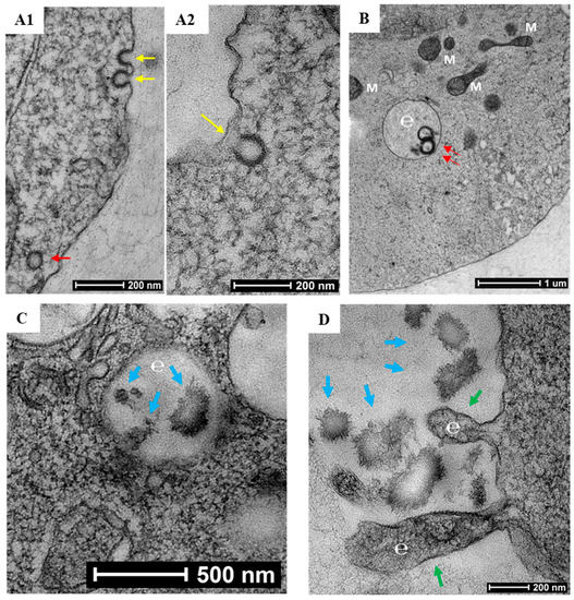 Electron micrographs of biomineralization. K562 cells were cultured for 72 h in MEMα containing 10% FBS, αGP (2 mM), and CIP (1 U/mL). (A1–2) Formation of caveolae (yellow arrows) initiated endocytosis of mineral matrix at the cytoplasmic membrane. (B,C) Caveolar endocytosis (red arrows) transported the mineral matrixes to the endosomes (e), where calcium phosphate agglomerates were synthesized (blue arrows; M = mitochondrion). (D) Endosomes (e) budded from the cell membrane (green arrows) to release the mineral agglomerates (blue arrows) into the extracellular space. Bars indicate various scales within the images.