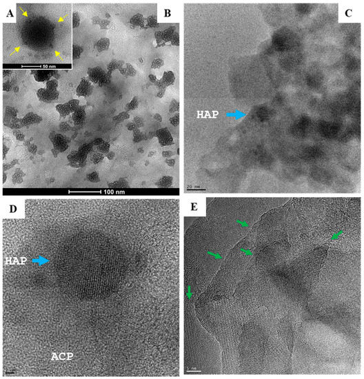 Electron micrographs depict two types of amorphous calcium phosphate (ACP) precursors. (A) Large spherical particles (50–100 nm) with remarkable electron-dense areas (inset, yellow arrows) are typical of chemically synthetized nanoparticles (scale bar = 50 nm). (B–D) Biologically synthetized agglomerates of much smaller granules composed of hydroxyapatite (HAP) crystallites (5–10 nm; blue arrow) produced by human cells grown for 7 days in MEMα/10% FBS with αGP (2 mM) and CIP (1 U/mL). Scale bars: (B) = 100 nm; (C) = 20 nm; (D) = 2 nm. (E) Boundaries (green arrows) formed between HAP grains (scale bar = 5 nm).