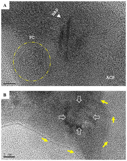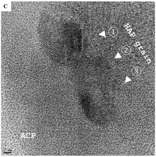 The development of hydroxyapatite (HAP). (A) Amorphous calcium phosphate (ACP) coiling (yellow arrows) was a remarkable precrystalline stage that formed polycrystalline masses (PC, in yellow circle). (B) Primary crystallization events occurred at the center of the coiling polycrystalline mass (yellow arrows) and resulted in 5–10 nm focus with the crystallographic texture of HAP (hollow arrows; scale bar = 5 nm). (C) Primary crystallization triggered a chain reaction that expanded HAP to crystallite grains (white arrows and numbers discrete HAP crystallites; scale bar = 2 nm).