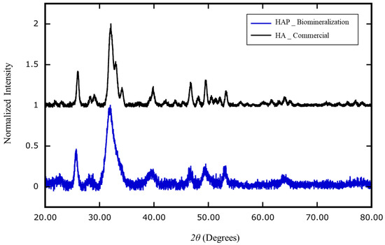 The composition and crystallinity of the biologically generated minerals were analyzed with an X-ray diffractometer [30,31]. The atomic composition of the extracted nanocrystals was genuine HAP, Ca10(PO4)6(OH)2; the atomic composition of the commercial bony nanoparticles was identified as calcium phosphate hydrates, Ca3(PO4)2∙xH2O (Figure 6).