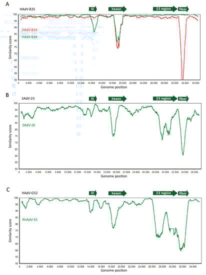 Similar genome sequence diversity between human- and non-human primate (NHP)-derived adenoviruses. Whole genome sequences of human- and NHP-derived adenoviruses were compared and the similarity between the sequences was plotted in Simplot. (A) The sequences of Human Adenoviruses (HAdV)-B14 (red line) and HAdV-B34 (green line) were aligned with HAdV-B35. (B) The sequences of Simian Adenoviruses (SAdV)-23 and SAdV-26, both chimpanzee-derived adenoviruses and members of the HAdV-E species, were aligned. (C) The sequences of HAdV-G52 and rhesus monkey-derived RhAdV-55 of species HAdV-G were aligned. These data demonstrate that in human adenoviruses, as well as in the adenoviruses isolated from NHPs, the main sequence diversity is found in the genes encoding the major capsid proteins penton-base (protein III), hexon, and fiber, and the genes located in the E3 region. This is consistent with the relatively frequent exchange of these gene segments between different adenoviruses. The plots were generated by aligning the nucleotide sequences of the human and simian adenoviruses as retrieved from Genbank according to the Smith–Waterman algorithm [] using default parameters in case of two sequences, or by MAFFT V7.407 [] using default parameters for multiple sequences. The sequence similarity graphs were generated using Simplot [] using a window size 800, and step size 10.