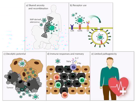 Non-human primate (NHP)-derived adenoviruses possess five main characteristics that would make them equally suitable as human-derived adenoviruses for use as oncolytic agents. (a) Human- and NHP-derived adenoviruses have shared ancestry and demonstrated recurrent and bidirectional cross-species transmission over the course of evolution. The homologous genomic organization of human- and NHP-derived adenoviruses allows for unrestrained recombination which transcends host origin. (b) Several attachment receptors are conserved between human- and NHP-derived adenoviruses, including the coxsackie and adenovirus receptor (CAR) and CD46, and possibly sialic acids (SA). Receptor-specificity depends on human adenovirus species rather than host origin. (c) NHP-derived adenoviruses can have oncolytic abilities in human tumor cells. Susceptibility to oncolysis is adenovirus type-dependent, similar to what is observed for human-derived adenoviruses. (d) The magnitude, endurance, and phenotype of the immune response elicited by NHP-derived adenoviruses are not substantially different from the responses elicited by human-derived adenoviruses. As NHP-derived adenoviral vectors induce higher frequencies of polyfunctional T effector (Teff) cells, as well as effector memory (Tem) and central memory (Tcm) T cells, they could be preferable for use as oncolytic vectors. (e) Similar to human-derived adenoviruses, NHP-derived adenoviruses cause only limited disease in their natural host. The safety of replication-deficient NHP-derived adenoviral vectors has been supported by multiple clinical studies and provides a basis for the safe use of NHP-derived adenoviral vectors as oncolytic agents in humans.