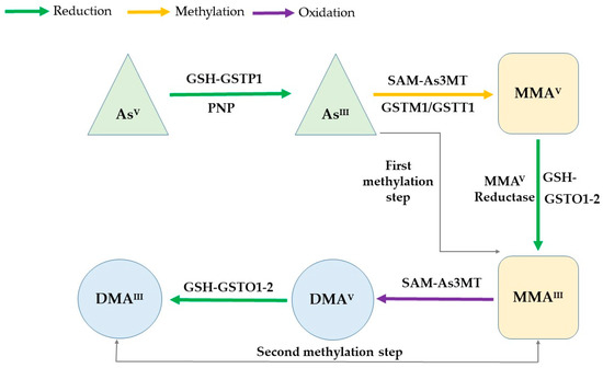 - Ding, L.; Saunders, R.J.; Drobná, Z.; Walton, F.S.; Xun, P.; Thomas, D.J.; Stýblo, M. Methylation of arsenic by recombinant human wild-type arsenic (+3 oxidation state) methyltransferase and its methionine 287 threonine (M287T) polymorph: Role of glutathione. Toxicol. Appl. Pharm. 2012, 264, 121–130. [Google Scholar] [CrossRef] [PubMed]