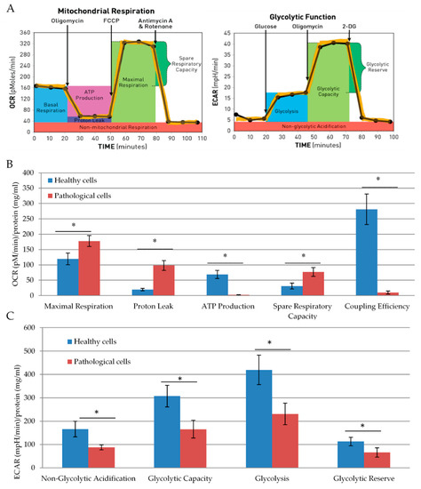 Mitochondrial respiration and glycolytic capacity of healthy and pathological primary hmMSC. (A) Schematic representation of oxygen consumption and glycolytic acidification assays. (B) Mitochondrial activity of healthy and pathological hmMSC. (C) Glycolytic capacity of healthy and pathological hmMSC. Oxygen consumption (pM) and glycolytic acidification (milli pH (mpH)/min) values were normalized to protein level (mg/mL). Data are shown as mean ± standard deviation (SD). The * p ≤ 0.05, n = 3 from two experiments. Student t test was calculated by an Excel program.