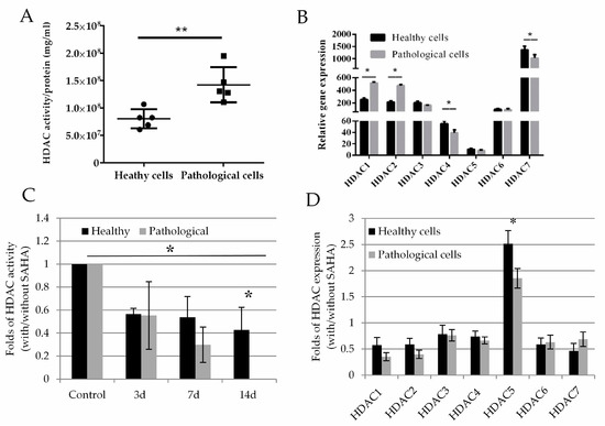HDAC activity and gene expression profile in healthy and pathological hmMSC. (A) HDAC activity in healthy and pathological hmMSC (arbitrary fluorescence units/per protein (mg/mL), n = 5. (B) Relative expression (2−ΔCT) of HDAC1–7 genes in healthy and pathological hmMSC, n = 3. Changed HDAC activity (C) and HDAC1–7 gene expression (2−ΔΔCT) (D) in healthy and pathological cells after exposure to 1 µM of SAHA for three days, n = 3. Gene expression was analyzed as follows: expression = 2−ΔCt × 100,000, where ΔCt = (Cttarget gene − Ctreference gene); relative expression = 2−ΔΔCt, where ΔΔCt is a subtraction of ΔCt of control cells from ΔCt of cells treated with SAHA. Data are shown as mean ± standard deviation (SD). The * p ≤ 0.05, ** p ≤ 0.01, n = 3–5 from 3 experiments. Student t-test was calculated by an Excel and Graphpad Prism 6 programs.