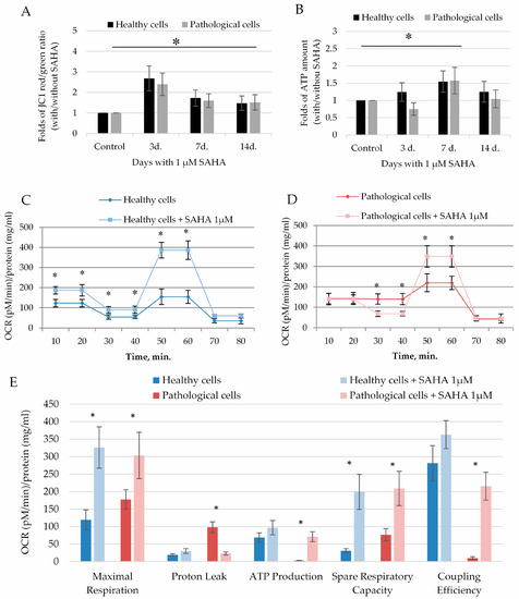 SAHA enhances the energetic status of healthy and pathological hmMSC. Mitochondrial membrane potential (A) and ATP production (B) in healthy and pathological hmMSCs exposed to 1 µM of SAHA for three days. Changes of oxygen consumption rate (OCR) ((pM)/protein (mg/mL)) in healthy (C) and pathological (D) cells and calculated mitochondrial parameters (E) after exposure to SAHA. Data are displayed as fold of changes with and without SAHA. Control–cells of both types not affected by SAHA. Data are shown as mean ± standard deviation (SD). The * p ≤ 0.05, n = 3 from 3 experiments. Student t-test was calculated by an Excel program.