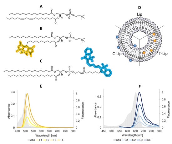 Molecular formulae of the lipid ingredients, postulated dye localization in the liposomal bilayer and fluorescence spectra of all dye-containing liposomal formulations (Day 0). The molecular formula of the most representative lipid in soy phosphatidylcholine (SPC) is provided (panel A) for comparison with the structures of the labeled phospholipids C and T (panel B and C, respectively). ACD/ChemSketch (Freeware) 2019 2.1 was used to draw the molecules and highlight the fluorescent moieties. All lipids ingredients are insoluble in water and highly soluble in methanol (respectively, >10000 and <1 mass parts of solvent required to dissolve 1 mass part of solute; according to Pharmacopeia’s definition). The liposome model (panel D) shows the expected localization of the labeled phospholipids according to their chemical structure and previous studies [10,11]. Panel E and F show the spectra for T-Lip and C-Lip formulations. The gray background spectrum represents the absorbance (primary y-axis), the solid colored lines refer to the fluorescent emission for all labeled formulations after normalization on the maximum values for T4 and C4 (secondary y-axis). Abbreviations: Lip refers to empty liposomes; T-Lip and C-Lip to the labeled formulations.