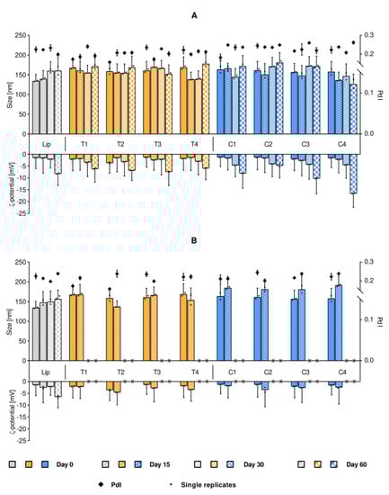 Stability of liposomal suspensions upon storage at 4 °C (panel A) and 25 °C (panel B). The stability is expressed as changes in original liposomal size and ζ-potential. Each bar cluster represents a suspension over time (Day 0, 15, 30 and 60, when measurable). The size is presented on the positive y-axis, where the bars refer to the main peak (primary y-axis), together with the associated SD (half width of the peaks) and the mean of the single replicates (small dots, n = 2). The diamonds correspond to the PdI (secondary y-axis) mean, with associated SD. The ζ-potential stability is displayed on the negative y-axis, with corresponding SD and single replicates. Isotonic phosphate buffer was used in pre-dilutions for size measurements, while distilled water was used for the ζ-potential determination. Abbreviations: Lip refers to empty liposomes (gray); T (yellow) and C (blue) refer to the lipid dye and the surface lipid dye, respectively; PdI is the polydispersity index; SD is the standard deviation.