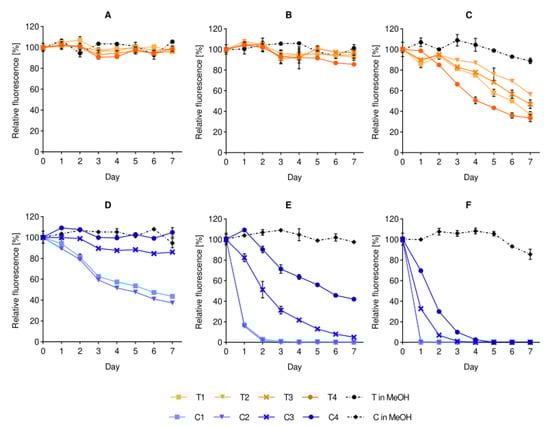 Effect of storage temperature on the fluorescence stability of liposomal dyes. The stability of T-containing formulations (panels A–C) and C-containing formulations (panels D–F) are compared to their respective dye solutions in methanol after daily sampling at the temperatures of 4 °C (A,D), 25 °C (B,E) and 37 °C (C,F). All formulations were pre-diluted in isotonic buffer to fit in the detectable range of the instrument. The fluorescence is expressed as mean (%) ± SD (n = 3), where 100% is the initial fluorescence value of each formulation (Day 0). Abbreviations: T refers to the lipid dye; C to the surface lipid dye; MeOH is short for methanol; SD is standard deviation.
