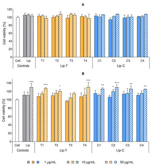Cytotoxicity of liposomal suspensions tested on RAW 264.7 macrophages (panel A) and HaCaT keratinocytes (panel B). Cell proliferation was expressed in percentage, referencing the untreated control (mean ± SD, n = 3). Each cluster refers to the same liposome formulation, applied in three different concentrations indicated in the legend. Concentration values correspond to the concentration of lipids per well (1, 10 and 50 µg/mL, complete RPMI-1640). Stars of significance indicate the increased proliferation over cell control (white bar): * p < 0.05; ** p < 0.01; *** p < 0.001. All dye-containing liposomes affected the cell proliferation in a similar manner as empty liposomes. Abbreviations: Lip refers to liposomes; T and C refer to the lipid dye and the surface lipid dye, respectively; Lip-T and Lip-C denote the dye-containing formulation; SD is standard deviation.