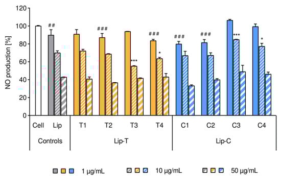 All liposomal formulations showed lipid concentration-dependent inhibition of NO production in LPS-activated macrophage (Figure 5) and the results were in agreement with the literature [16,17]. Liposomal formulations at the concentration of 50 µg/mL inhibited approximately 50% of NO production as compared to the non-treated control.
