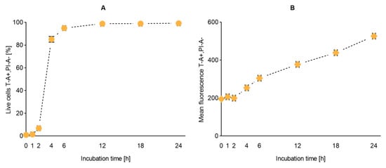 After confirming the safety and retained biological activity of the liposomal suspensions, we proceeded to follow their cellular uptake. Based on the stability data, we have selected the T1 liposomes as model dye-in-liposomes suspension. T1 liposomes comprise the lowest dye-to-lipid ratio, which would be highly advantageous considering both cost and possible interference. Liposomal uptake was quantified and imaged by flow cytometry at different time points over 24 h. According to the number of cells screened as T-positive (T-A +), the uptake was proven in almost all cells within the first 6 h of incubation (Figure 6A). On the other hand, the total uptake—quantified as mean peak of fluorescence—did not reach a plateau in the 24 h of analysis, thus, indicating that no saturation took place in the tested timeframe (Figure 6B).