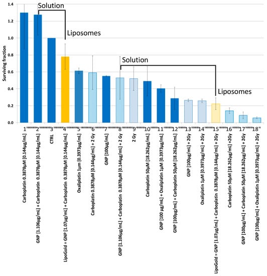 Figure 1 shows the cytotoxicity of HCT116 cells for five different treatments (carboplatin, GNP, GNP + carboplatin, LipoGold, oxaliplatin and GNP + oxaliplatin) at different relative concentrations, with or without a fixed X-ray dose of 2 Gy. The mean survival fraction (SF) for all groups are relative to the control group (CTRL, column 3), which is normalized to 1. For the groups treated without irradiation: The low dose carboplatin [0.144 µg/mL] group (column 1) and the combination of GNPs [1.106 µg/mL] plus carboplatin [0.144 µg/mL] group (column 2) have a SF higher than the control group (CTRL, column 3) LipoGold (column 4), that contains the same concentrations as the bare products (GNPs [1.106 µg/mL] and carboplatin [0.144 µg/mL] (column 2)), produces a SF barely lower than that of the CTRL (p = 0.06). Groups for oxaliplatin [0.3973 µg/mL] (column 5), a high dose of GNPs [100 µg/mL] (column 7), carboplatin [18.262 µg/mL] (column 10) and the combination of GNPs [100 µg/mL] plus oxaliplatin [0.3973 µg/mL] (column 11), have SF between 0.61 and 0.40. The combination of a high dose of GNPs [100 µg/mL] plus carboplatin [18.262 µg/mL] (column 12) has a SF of 0.29.