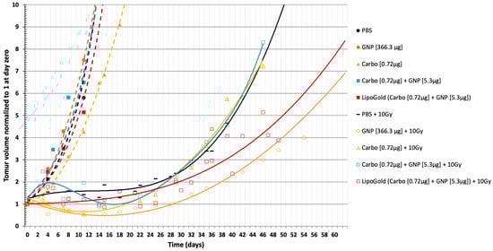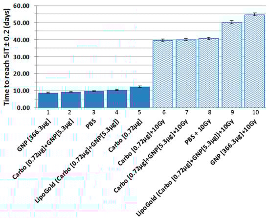 Figure 2 shows the tumor growth delay after four different treatments (carboplatin, GNP, GNP + carboplatin and LipoGold) at different dosages, with or without X-ray irradiation. The time to reach five times the initial volume of the tumor ±0.2 (5IT) was chosen as a reference point to compare each group. 5IT is also reported in Figure 3. The control group was treated with injection of phosphate buffer saline (column 3) with a 5IT of 9.9 days. No significant difference was observed between PBS (phosphate buffer saline) (column 3), the combination of carboplatin [0.72 µg] plus GNP [5.3 µg] (column 2) and LipoGold (column 4). Only a high dose of carboplatin [0.72 µg] (column 5) shows a small benefit (p < 0.05) compared to the PBS group. Interestingly, GNP alone (column 1) shown a faster tumor growth than PBS control (p < 0.05). This may be another hormesis phenomenon due to an unknown protective role of low dose of GNP on tumor cell. The same potential protective effect is also observable when we compare carboplatin [0.72 µg] (column 5) to the combination of carboplatin [0.72 µg] plus GNP [5.3 µg] (column 2) (p < 0.05). Treatment with radiation alone produces a 5IT of 40.6 days (column 8), but combination of radiation with carboplatin [0.72 µg] + 10 Gy (column 6) or the combination of carboplatin [0.72 µg] plus GNPs [5.3 µg] + 10 Gy (column 7) do not affect the 5IT. LipoGold (carboplatin [0.72 µg] plus GNP [5.3 µg]) + 10Gy (column 9) has a 5IT of 50.4 days. It takes a much higher dose of GNP alone [366.3 µg] than in LipoGold (column 10) to bring 5IT to 53.9 days.