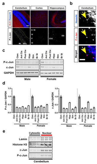 To study this constitutive cerebellar p-c-Jun in fully wild-type (WT) mice, we next examined the uninjured male C57Bl/6J mouse brain. We first assessed DLK expression in the cerebellum, forebrain, and hippocampus of these mice using immunofluorescence staining (Figure 2a). The specificity of the DLK antibody was confirmed using DLK −/− embryonic mouse brains (Figure S2a). In each region of the WT mouse brain, DLK immunoreactivity broadly labeled neurons and their processes, with particular intensity in the molecular layer of the cerebellum and in the mossy fibers extending to the CA3 region of the hippocampus (Figure 2a). Morphological examination revealed that DLK is predominantly expressed in axons, consistent with previous reports [46]. Next, we examined p-c-Jun; these WT mice were handled for 4 days prior to sacrifice to prevent stress-induced phosphorylation of c-Jun. Intense immunoreactivity for p-c-Jun was noted in the nuclei in the granule cell layer of the cerebellum within cells that have the morphological appearance of cerebellar granule neurons (Figure 2a,b). In contrast, p-c-Jun staining was sparse in other brain regions with only rare p-c-Jun-positive nuclei. Next we compared DLK, p-c-Jun, and c-Jun levels in the cerebellum, anterior forebrain, posterior forebrain, hippocampus, striatum, and brain stem of WT mice. The antibody specifically detected a band at 120 kD that was absent in the DLK −/− mouse brain lysate (Figure S2b). Using this validated DLK antibody, we found that DLK levels across all the brains regions from WT mice were comparable, with the cerebellum expressing ~20% more DLK compared to the rest of the brain regions analyzed (Figure S3a,b). The biochemical assessment of p-c-Jun aligned with the immunofluorescence data: levels were approximately 6-fold higher in the cerebellum than in rest of the brain regions (Figure 2c,d). As would be predicted since p-c-Jun drives the transcription of Jun, c-Jun levels were also higher in the cerebellum [47]. This increase in p-c-Jun in the cerebellum was not sex-specific as it was observed in both male and female mice. To confirm the subcellular location of cerebellar p-c-Jun, we isolated nuclear and cytosolic fractions. The purity of the subcellular fractions were confirmed by immunoblotting for Lamin B and Histone H3, which are nuclear proteins (Figure 2e). In the cerebellum of WT mice, while most of the c-jun was nuclear, some c-jun were cytosolic. On the contrary, p-c-Jun was almost exclusively observed in nuclear extracts, confirming the immunostaining results.
