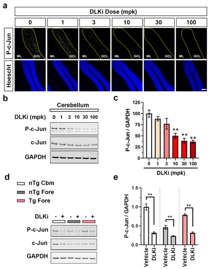 3.2. Constitutive Cerebellar p-c-Jun and tau-Induced Forebrain p-c-Jun Are Both DLK Dependent