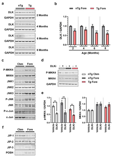 To understand the mechanism by which nuclear p-c-Jun is increased in Tg forebrain, we examined the DLK signaling pathway by Western blot analysis of nTg and Tg forebrain lysates from 2, 4, 6, and 8 months old mice. In contrast to observations in nerve injury models, where stabilization of DLK is linked to its signaling activity, increased p-c-Jun in the Tg forebrain did not coincide with increased DLK protein levels (Figure 4a,b); on the contrary, DLK protein levels were lower in the Tg forebrain, perhaps due to the axonal loss in this model. Since DLK stabilization did not explain the increased p-c-jun, we next examined MKK4 and MKK7, which are the direct substrates of DLK, the three JNK isoforms, c-Jun, and the relevant phosphorylated forms of these proteins when possible. In adult WT mouse cerebellum and forebrain (Figure 4c), MKK4, p-MKK4, JNK1, JNK3, and total p-JNK protein levels were all higher in the forebrain than in the cerebellum in WT mice, while before, p-c-Jun levels were higher in the cerebellum. MKK7 total protein did not differ by brain region, while pMKK7 was undetectable with available antibodies. Thus, the low nuclear p-c-Jun in the uninjured forebrain is not due to the absence of DLK signaling pathway components; conversely many of these proteins are higher in the forebrain.