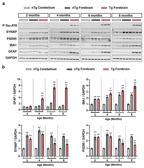 We next wanted to understand how induction of p-c-Jun in the forebrain of the Tg mice related to the onset of pathology, therefore we compared it to markers of neurodegeneration over time. Immunoblotting with AT8 antibody confirmed that Tg forebrain exhibited age-dependent accumulation of hyperphosphorylated tau (Figure 5a,b). As expected, cerebellar and forebrain lysates from nTg mice had negligible amounts of hyperphosphorylated tau. Next we examined markers of neuronal injury and synaptic proteins and, as expected, observed increases in the markers of gliosis, GFAP, and IBA1, denoting astrocytic and microglial activation, and reduction in the synaptic proteins synaptophysin (SYNAP, a presynaptic protein) and PSD-95 (a post-synaptic protein) compared to nTg forebrain.